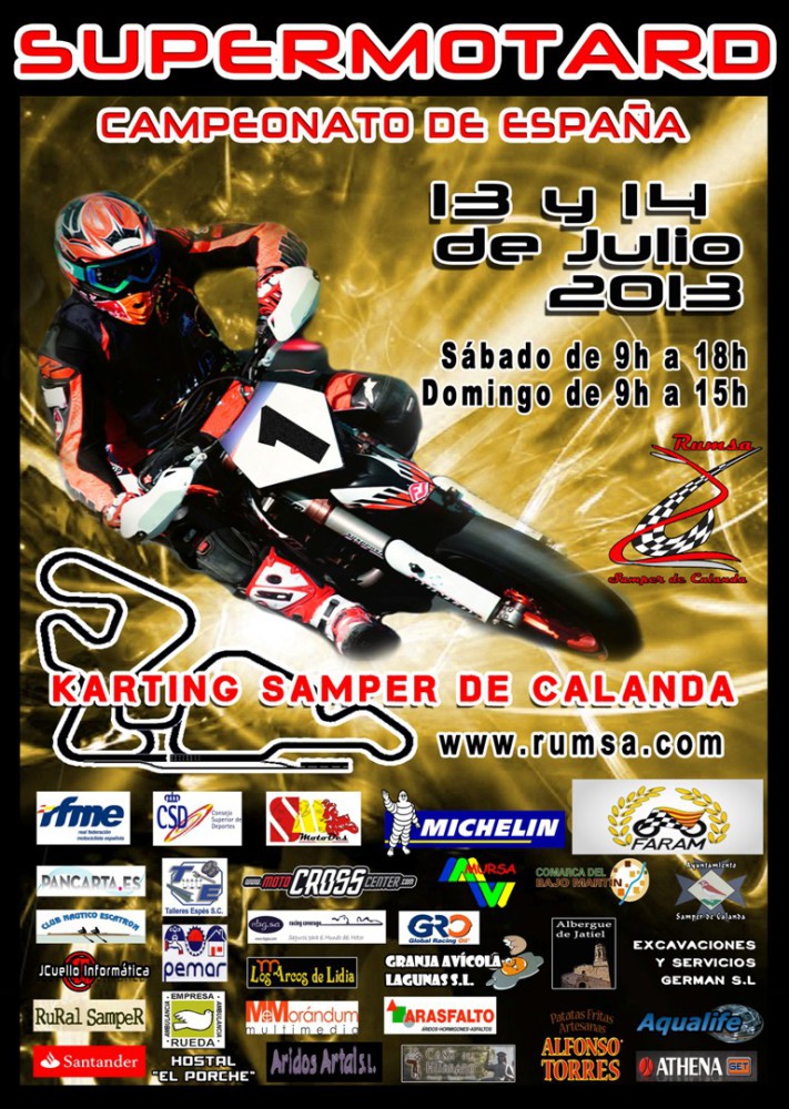 Este fin de semana se disputará en Samper de Calanda (Teruel) la tercera cita de la temporada 2013 del Campeonato de España de Supermotard. Esta temporada el CeSMotard ha vuelto a Sevilla, se estrena en este trazado de Teruel y todavía tiene una carrera a designar su lugar de celebración. Villena disputó la segunda cita del año y repiten Albaida y Alcarràs.