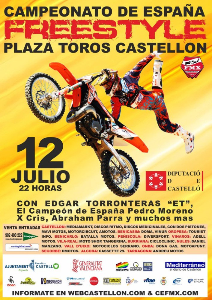 Así que después de Valencia, el RFME Campeonato de España de Freestyle no se marcha de la Comunidad levantina y viaja hasta Castellón para celebrar una nueva prueba. Será la Plaza de Toros castellonense la que acoja a los pilotos que realizarán sus mejores trucos para estar en el pódium final. Ya en la capital del Turia se vivió una gran noche hace apenas un mes y ahora le toca disfrutar a los aficionados de Castellón. El cartel de participantes no puede ser mejor y es que estarán, entre otros, el actual campeón de España y líder de la general, Pedro Moreno, el ganador en Valencia Chris Meyer, o el subcampeón de España 2013, Edgar Torronteras.